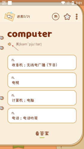 2. 在单词详情页面,点击喇叭图标即可播放该单词的标准发音。
