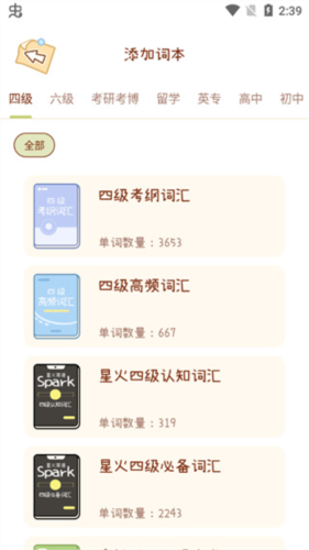 6. 词库海量:覆盖小学、初中、四六级、考研、托福、雅思、托业、BEC、SAT、GRE、GMAT等权威词库,满足不同学习阶段需求。