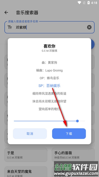 在显示的搜索结果中,选择你喜欢的音乐点击进入,即可进行在线试听或下载到本地。