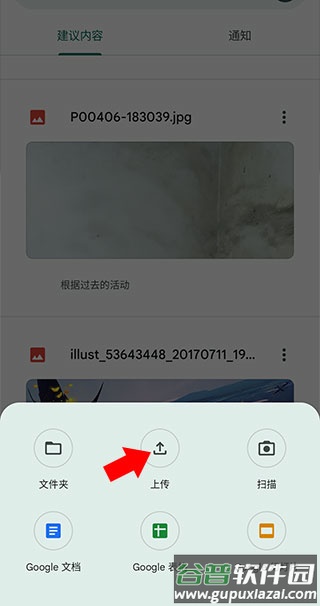 2. 从底部弹窗中选择【上传】选项,然后选取要上传的文件即可