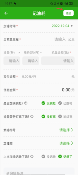 3、输入加油金额、时间、加油站位置等信息,最后点击添加按钮完成记录。