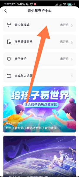 3、在页面顶部找到“青少年模式”选项,点击进入设置界面。