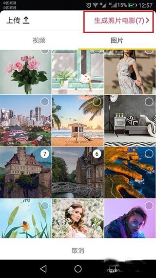 4、勾选需使用的照片(至少两张),点击右上角“生成照片电影”。