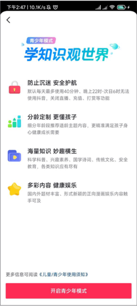 4、在该界面底部点击“开启青少年模式”按钮,即可完成设置。