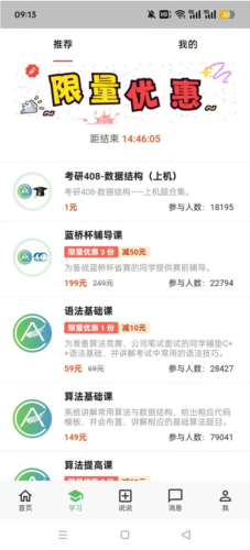 3、在【学习】板块中,设有多种类型的付费课程,用户可根据自身需要选择报名学习。
