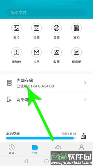 打开手机桌面点击“文件管理”,然后点击“内部存储”。