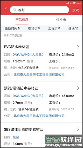 2、在搜索框输入建材名称或相关关键词,可迅速检索目标产品。