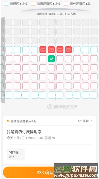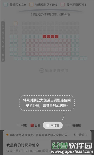 4. 进入选座界面,座位布局已根据安全距离要求调整。