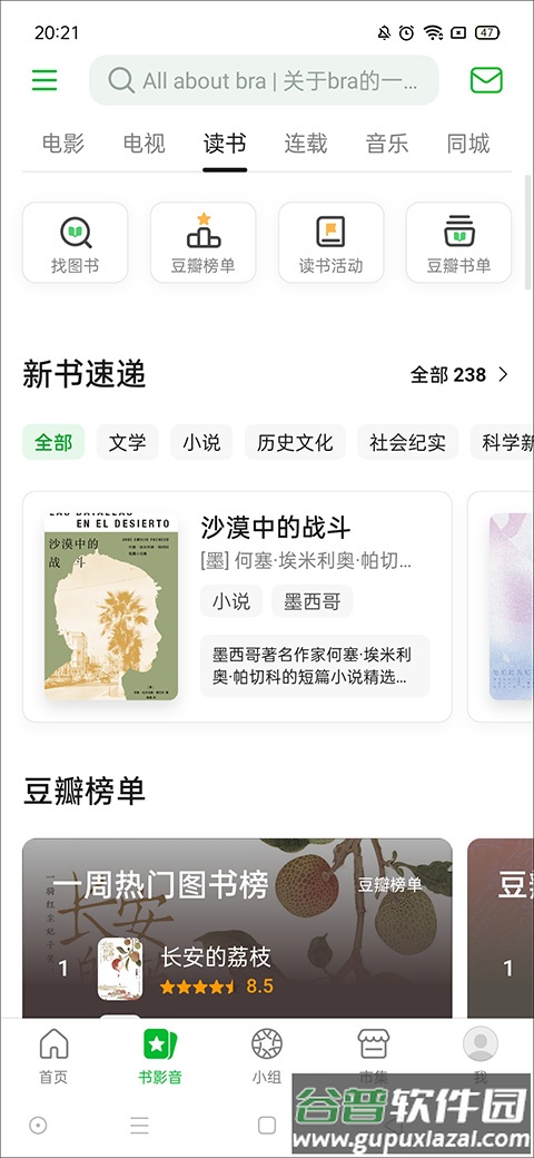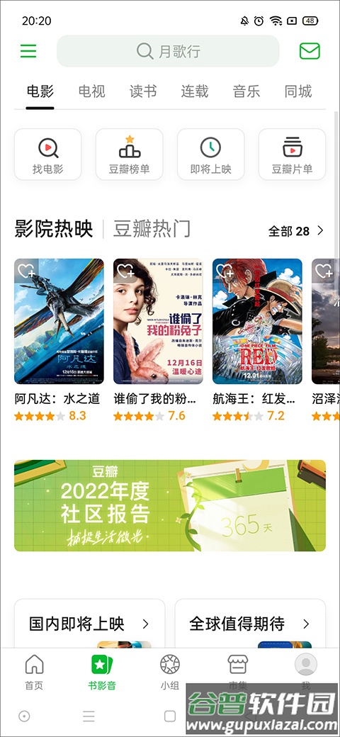 提供电影、电视、读书、音乐及同城活动等核心内容,是应用的主要功能板块。