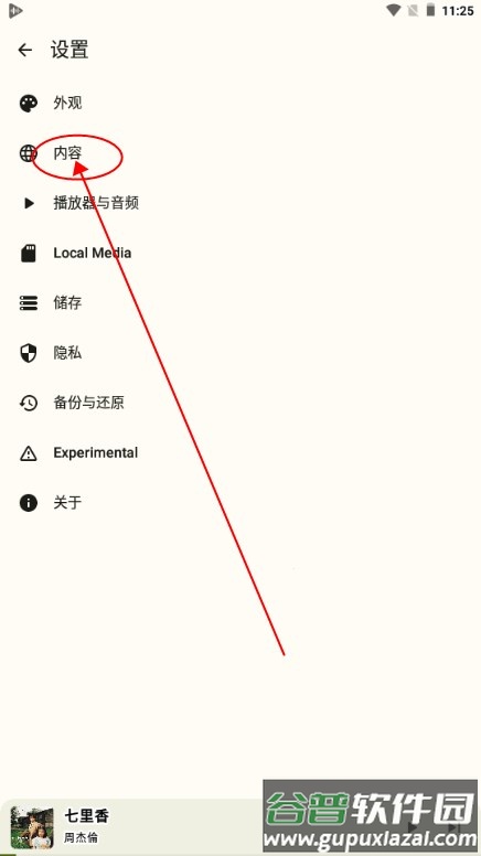2、在设置菜单中找到并点击“内容”选项;
