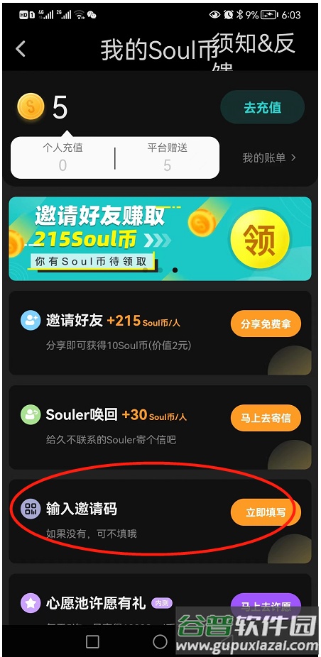 第二步:在Soul币页面中,向下滑动可在底部看到“输入邀请码”的入口,如下图所示: