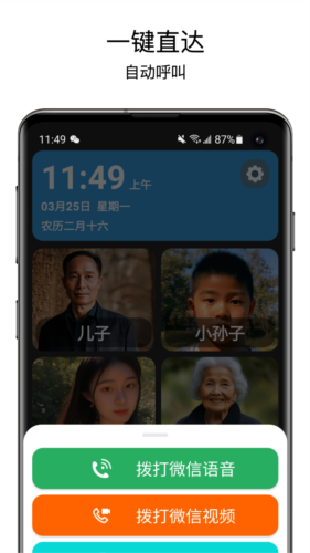老人桌面一键直达是一款专门为长辈开发的手机桌面工具,界面清晰大方,操作过程直接明了。采用大号字体与放大图标,使桌面布局调整轻松完成。一键快速拨打电话或发起视频通话,贴合老年人日常联络需要,让科技带来的方便近在眼前。无需繁琐操作,轻触屏幕就能快速开启微信视频或语音通话,显著提高生活与交流的效率。