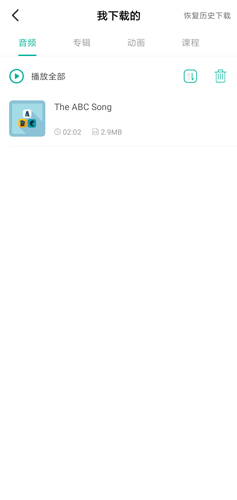 2、页面内会显示已下载的视频或歌曲,内容按音频、专辑、动画、课程进行分类展示;