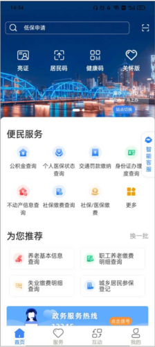 1、【首页】设有便民服务、推荐内容及搜索栏等板块。便民服务提供公积金、个人医保、身份证、不动产等信息查询,并可在线缴纳社保、医保等费用。