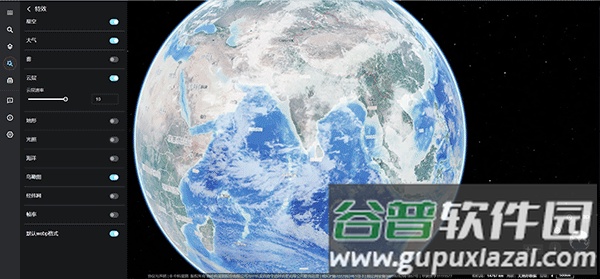3、支持星空、大气、雾、光照、海洋、云层、地形等多种数字地球特效设置;
