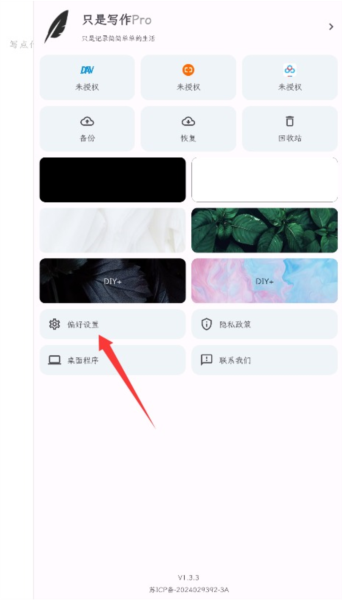 3、往左滑动主界面则会显示设置菜单,可调整字体、背景等个性化写作参数。