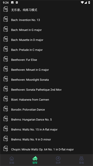2、切换到钢琴功能页面,该页面提供了丰富的曲谱资源供用户练习使用。