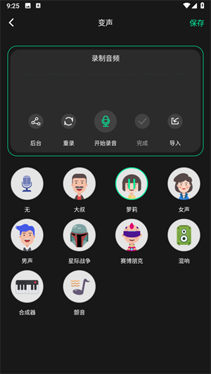 3、从提供的多种人声效果中选择想要的变声类型,最后点击保存按钮完成操作。