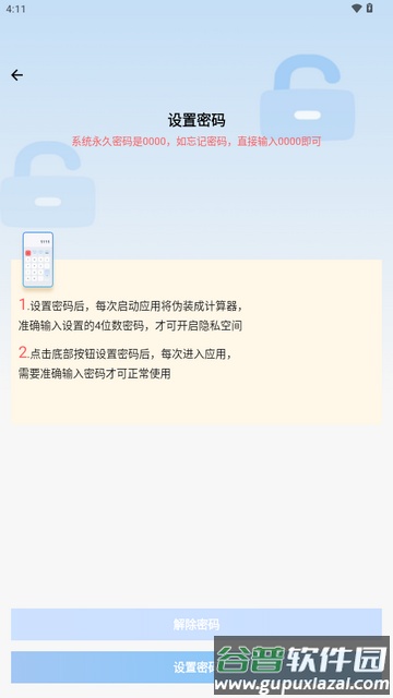 6.密码界面会伪装成计算器样式。