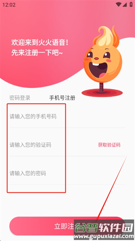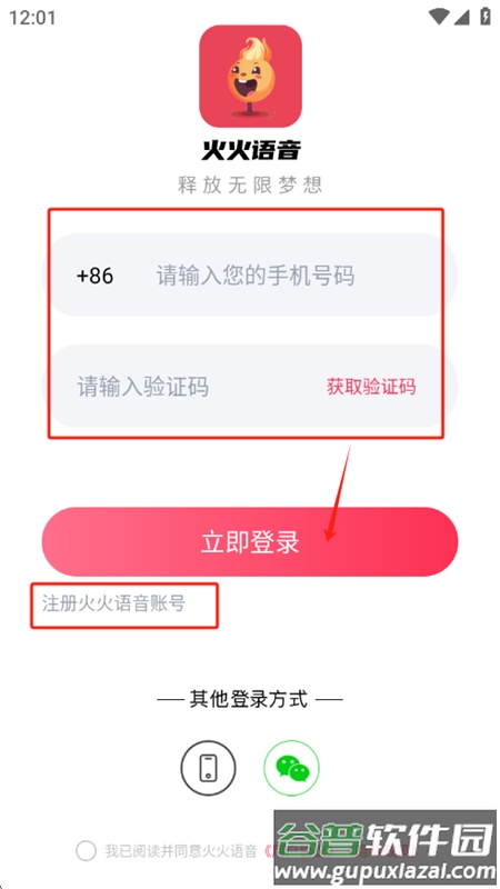 3、输入手机号和验证码即可快速登录,若未注册可点击注册火火语音账号;