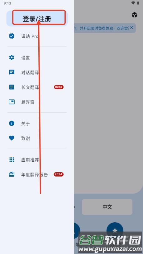 2、在菜单中找到并点击登录或注册选项;