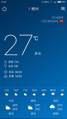 2、便捷交互操作:采用上下滑动的方式,能快速查看天气趋势、风速及各类生活指数;