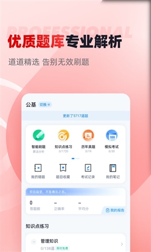 软件内包含考点练习、通用卷与地区卷模拟,以及按考试比例随机抽题的真题考场。成绩单实时记录学习数据,反馈近期状态与正确率变化,增强考生应试信心。