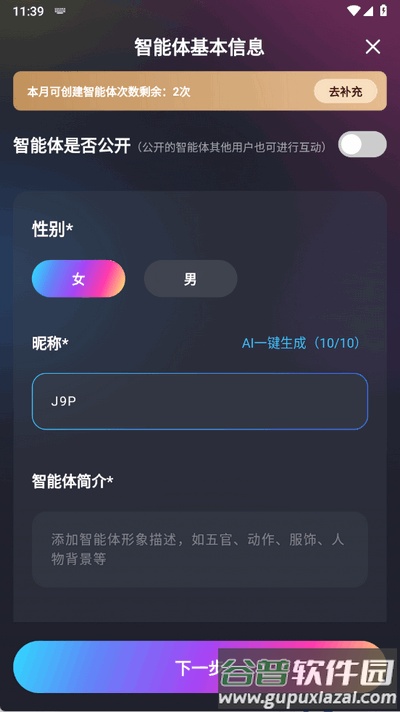 5、详细填写智能体的基本信息,完成后点击下一步继续。