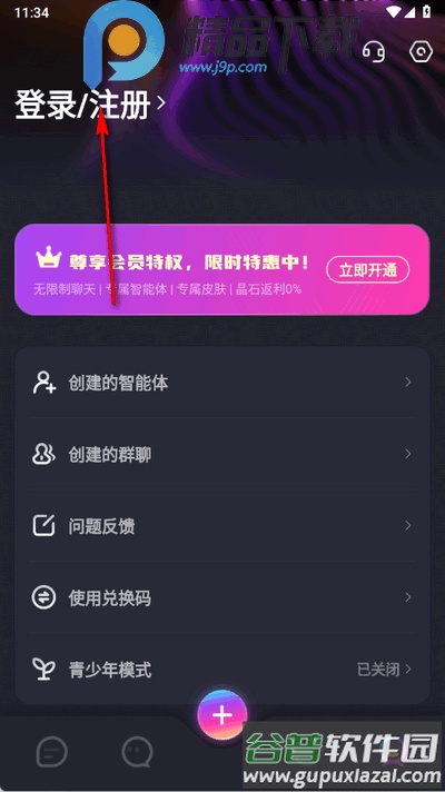 1、进入个人中心界面,点击页面上方的登录或注册入口。