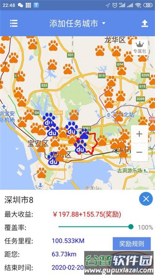 1、进入软件后选择城市,地图上会显示多种任务标记;蓝色标记代表可领取任务,黄色标记则已被他人领取。