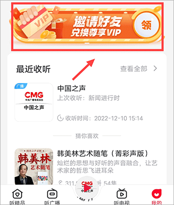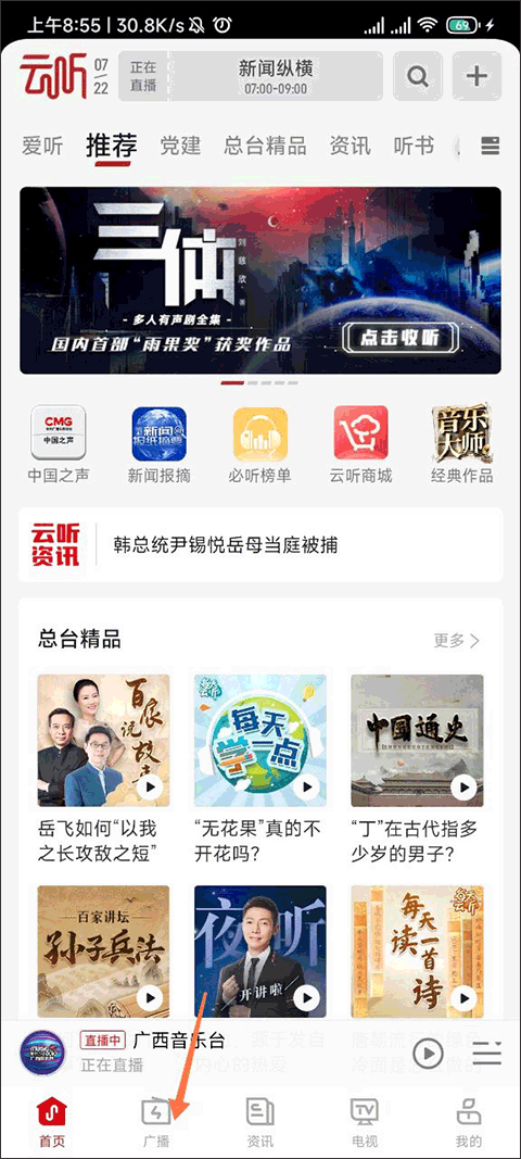 进入应用后,点击底部广播栏目,切换到广播界面;