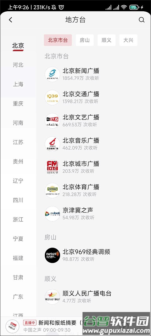 应用借助网络电台优势,允许用户跨区域收听其他城市的电台节目,操作方式如下。