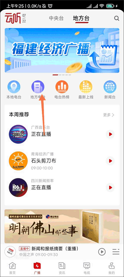 在广播界面中选择地方台分类,找到本地电台入口并点击进入;