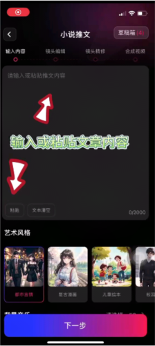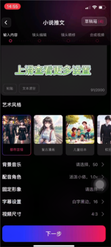 4、向上滑动界面,设置艺术风格、背景音乐、配音角色等参数,完成设置后点击下一步;