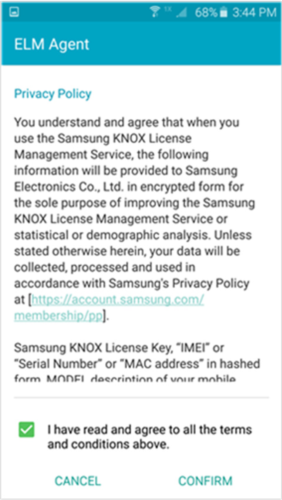 若使用三星Knox设备,系统会先要求您查看并确认ELM代理隐私政策。