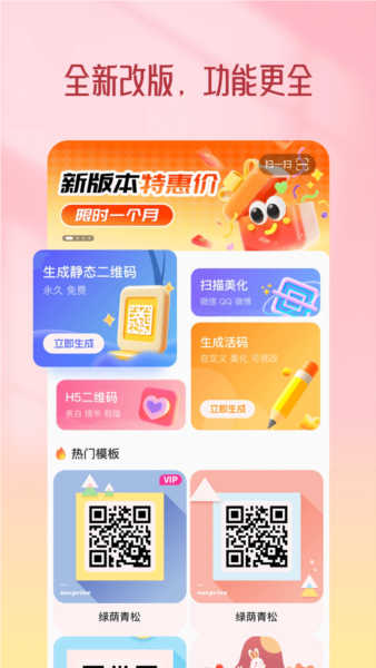 4、拥有多个功能服务专区,除了基础生成与美化,还包括扫描美化、H5二维码制作等;