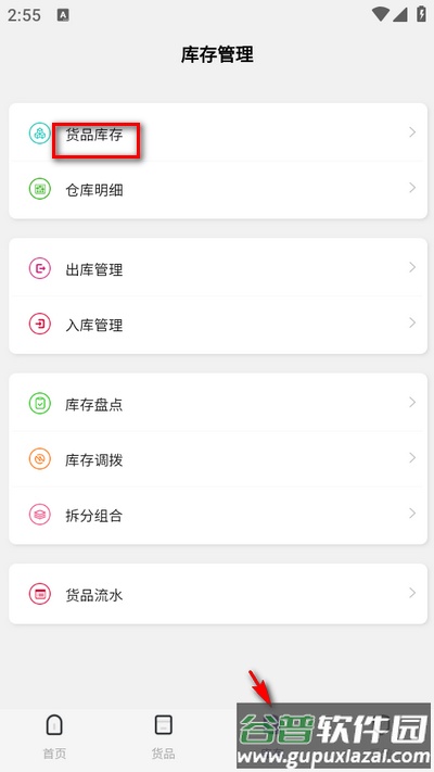 打开应用后,点击底部导航栏的库存选项;进入库存页面后,点击上方的货品库存按钮即可查看。