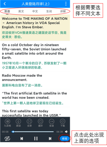 1. 跟读训练模块让用户在模仿听力原声的同时,改善自身的语音语调。