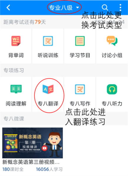 1. 设有适合不同阶段的翻译练习课程。查找路径:首页-搜索“翻译”或首页-分类-英语考试。