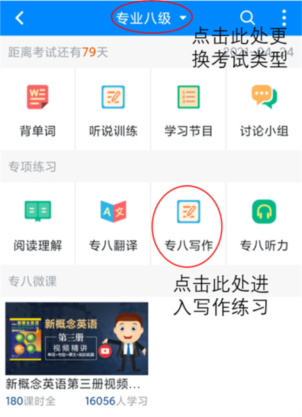 1. 提供针对不同英语水平的写作课程。查找路径:首页-搜索“写作”或首页-分类-英语考试。