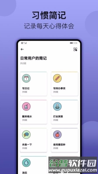 3、每日推送专属激励卡片,完成全部习惯后可收集卡片,背面支持记录当日心得;