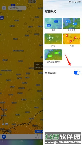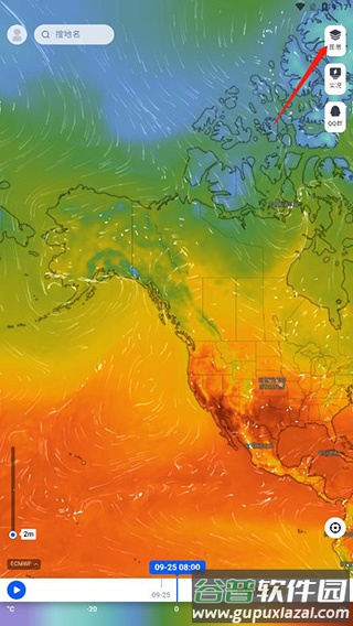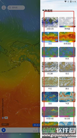 2.软件内提供多种气象图层分类,例如卫星云图、降雨量、温度、体感温度及风场等,用户可选择所需图层;