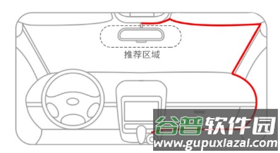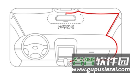 (1)粘贴记录仪:安装前清洁挡风玻璃表面,撕下3M胶贴纸,将设备固定在图中推荐的区域。
