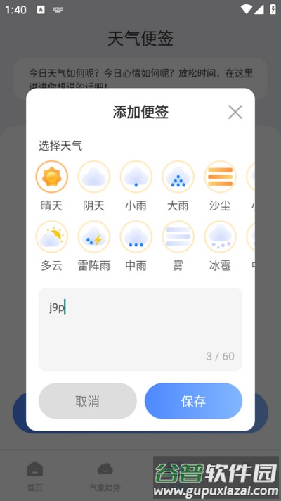2、选择对应天气图标并输入便签内容,最后点击保存即可。