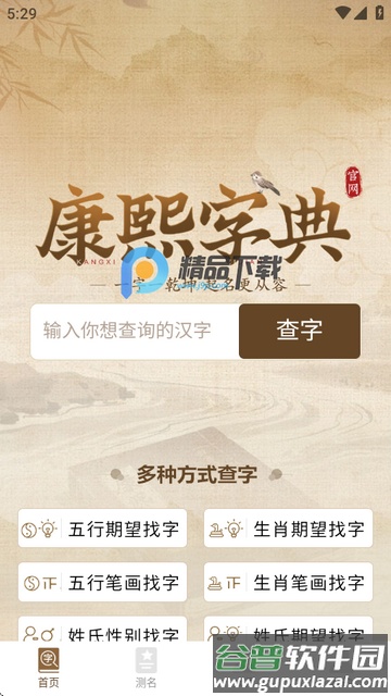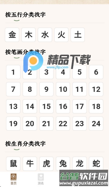1、启动软件后,可依据五行分类、笔画数或生肖属性查找汉字。