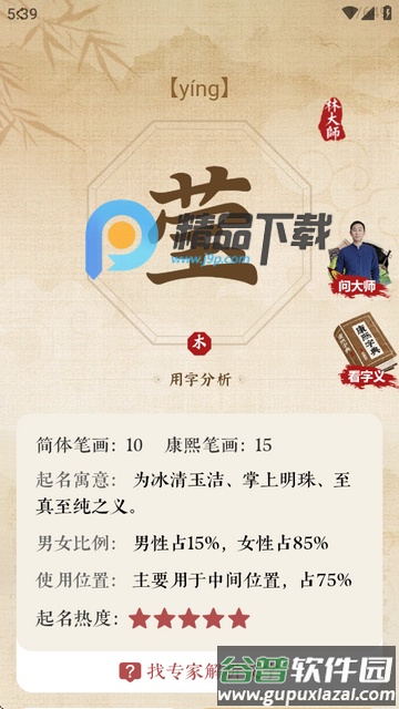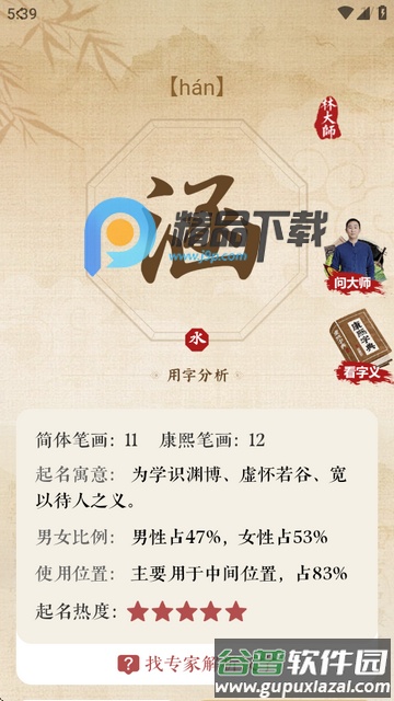 3、能够查看汉字笔画数、起名寓意解析、男女使用比例及常见出现位置。