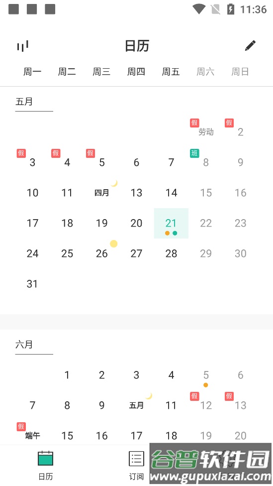 日历视图按月展示,事务分布一目了然,支持快速创建事件,并显示法定节假日、调休安排、农历日期及传统节气。