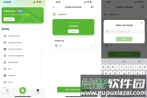 安装后打开应用,点击底部“更多”进入菜单,选择“个人资料和好友”;点击“添加新朋友”并输入对方的专属代码;同时你的代码也会显示在此处,双方需互相添加才能建立连接。