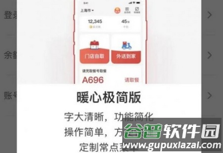 所有字体与图标均明显放大,界面元素也大幅精简。极简版首页最突出的是“门店自取”和“外送到家”两个点餐入口,同时保留了会员积分、卡包、会员码等关键信息,并新增了推荐菜单选项。