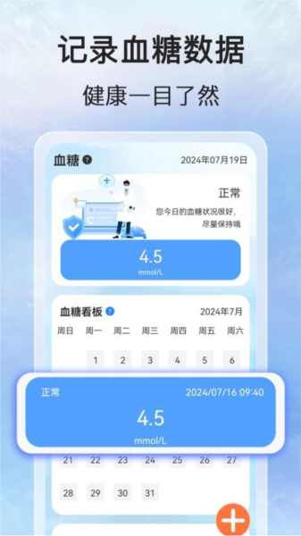 应用支持快速录入血压与血糖数值;用户可以随时添加测量结果,操作过程简便流畅。